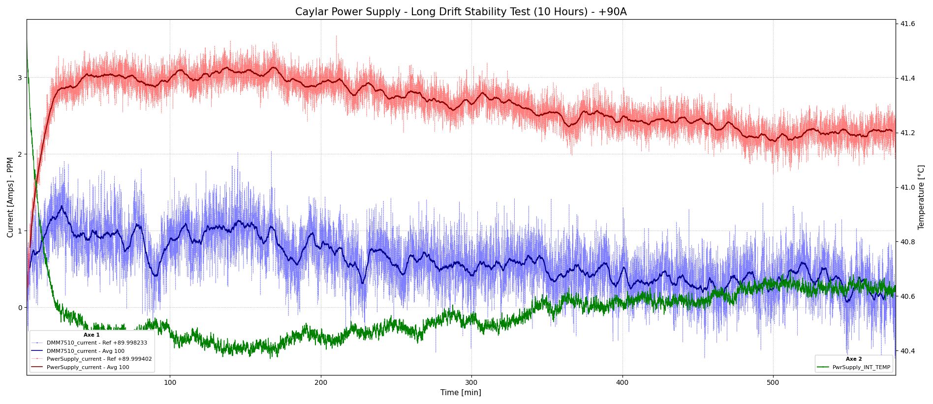 Red: Internal reading from CAYLAR porwer supply / Blue: External independent reading / Green: Internal Temperature